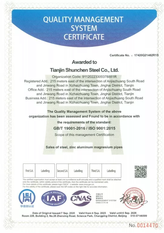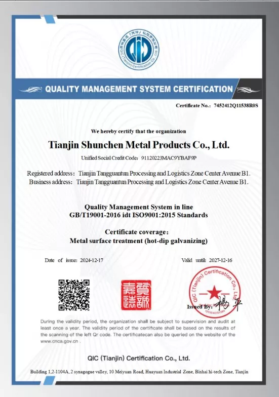 Tianjin Shunchen Industrial Company sukaupė daugiau nei tris dešimtmečius gamybos patirtį plieno pramonėje. Įmonė turi ISO 9000, 3A sistemos sertifikatus, taip pat Europos Sąjungos CE sertifikatą, sukūrė visą pramoninės grandinės išdėstymą nuo cinkavimo apdorojimo iki pardavimo ir platinimo. Vykdydama griežtus 12 etapų proceso srautus ir trijų pakopų visapusišką tikrinimo mechanizmą, bendrovė pasiekė nulio metinių kokybės ir saugos nelaimingų atsitikimų bei nulinės eilės numatytųjų 12 metų iš eilės rekordą. „Shunchen Industrial“ ištisus metus prižiūri daugiau nei 20 000 tonų cinkuoto plieno taškinį inventorių, sudarydama didelio masto cinkuoto plieno prekybos centrą, kuriame integruotas sandėliavimas ir platinimas. Sandėlis užima 10 000 kvadratinių metrų plotą ir užtikrina tvirtą integruotą gamybos ir pardavimo paslaugą.